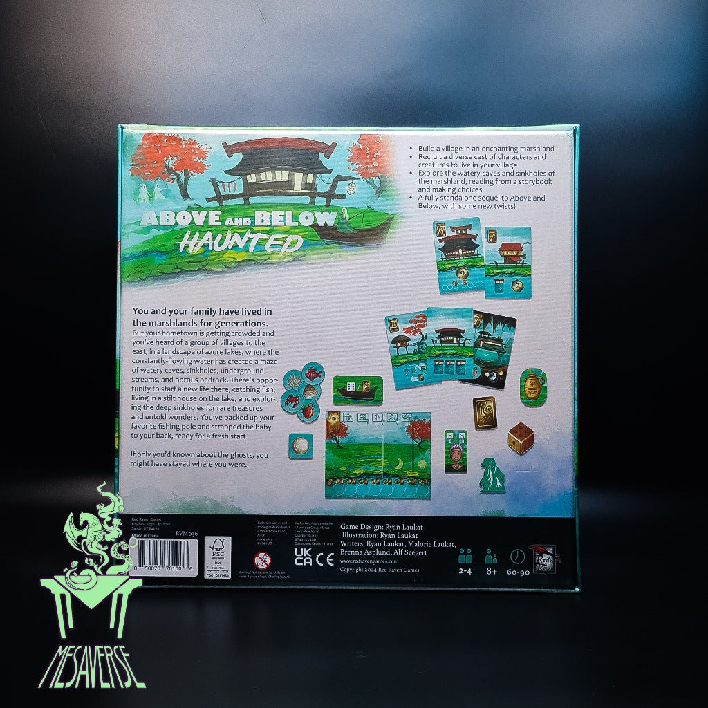 Above and Below: Haunted is a standalone sequel to Above and Below (The character tokens are compatible between editions), planned to release on the 10th anniversary of the original game. As in the original game, players compete to build the best village by recruiting villagers, constructing buildings, and exploring the caves below ground. Above and Below: Haunted features new stories and explores a new setting in the world of Arzium.