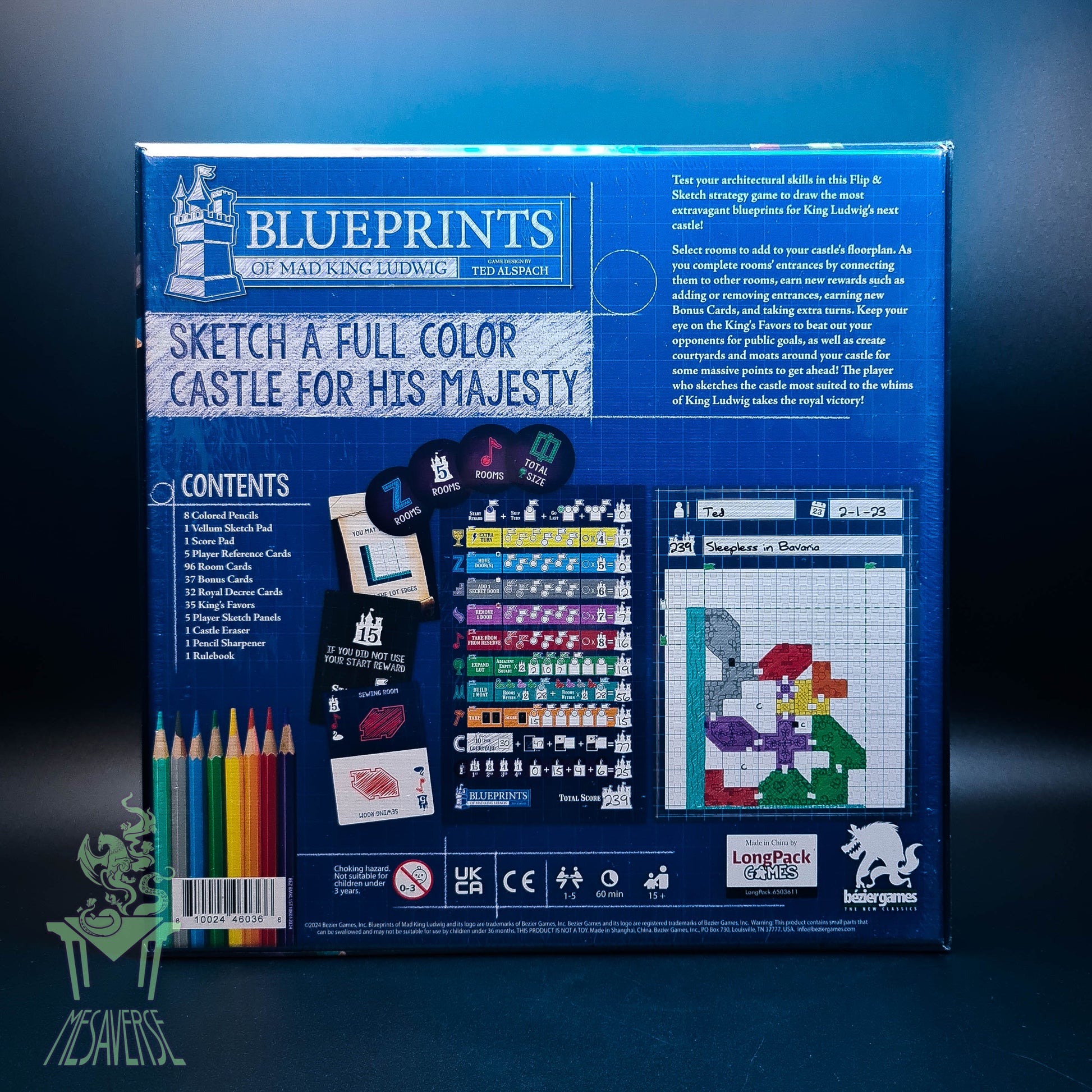 Test your architectural skills in Blueprints of Mad King Ludwig, a flip-and-sketch strategy game to draw the most extravagant blueprints for King Ludwig's next castle! Select rooms to add to your castle's floor plan. As you complete rooms' entrances by connecting them to other rooms, earn new abilities such as adding or removing entrances, earning new bonus cards, and taking extra turns. Keep your eye on the King's favors to beat out your opponents for public goals, as well as create courtyards and moats around your castle for some massive points to get ahead! The player who sketches the castle most suited to the whims of King Ludwig takes the royal victory!