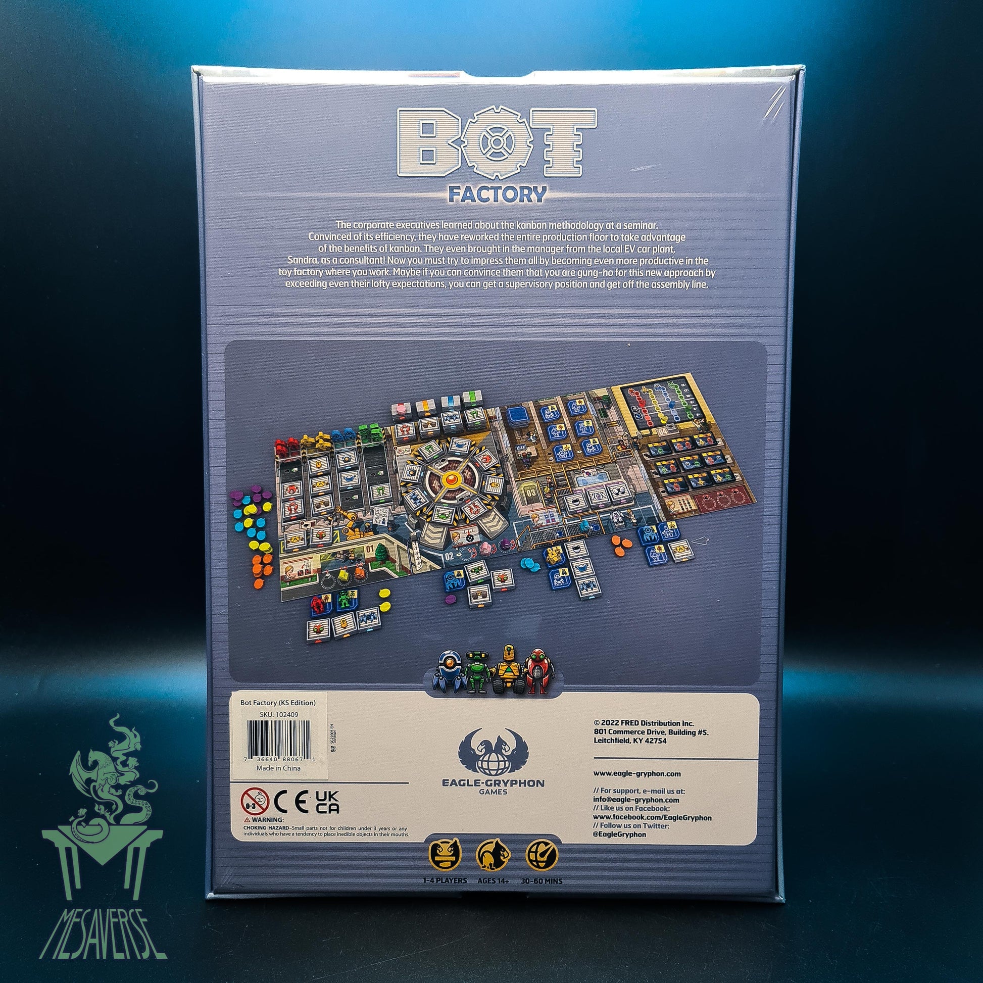 Your goal in Bot Factory is to gather projects and parts, then assemble bots, thereby fulfilling demand goals and improving the value of the bot you are making. Sandra, the factory manager from Kanban, is present here, moving to different departments and using the players' spaces. The game uses the same worker-placement mechanism from Kanban in which turn order is established by the workers' positions on the board.