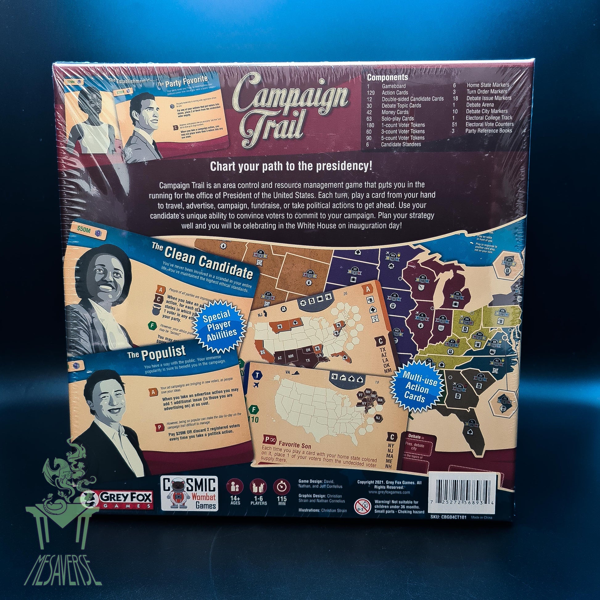 Campaign Trail uses card driven actions to implement your strategy. Your goal is to have the most voters for your party in enough states to win a majority of electoral votes. If you have the most voters in a state you are awarded that state's electoral votes (victory points). At the end of the game the player with the most electoral votes wins and is declared the president!