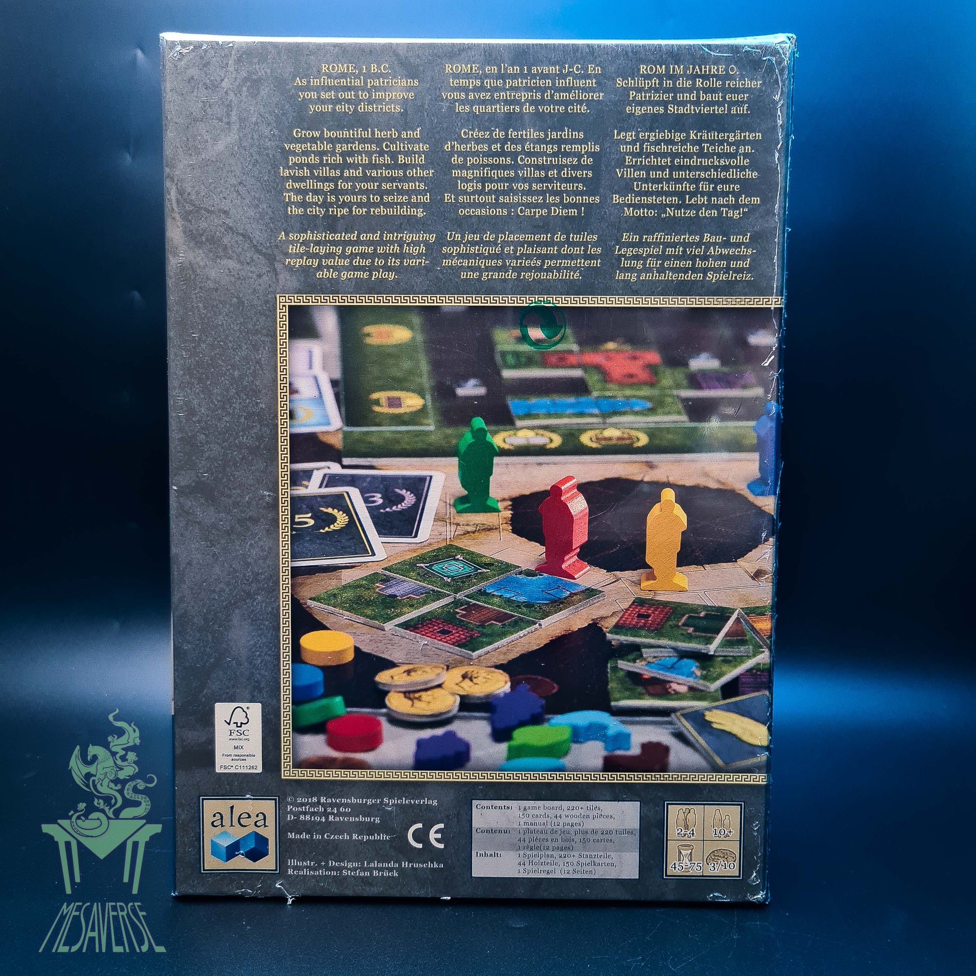The players slip into the role of rich patricians in ancient Rome. Everyone is trying to build a lucrative city district to score as many prestige points as possible. The novel way to get to the individual buildings of a district combined with a large variety of score cards make for an unusual game with a large number of strategies. From the successful designer, Stefan Feld.