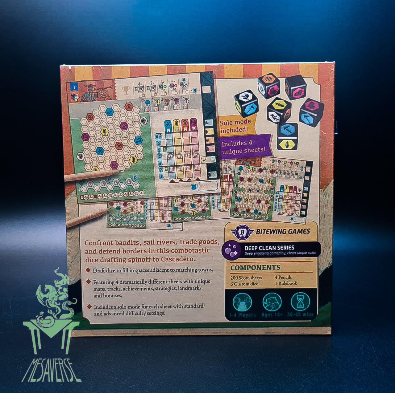 Cascadito is the smaller spiritual sibling to Reiner Knizia’s big box tile placement strategy game, Cascadero. Each player receives their own sheet and a pencil. 6 dice are rolled, and players take turns drafting a die used to fill in a space on their map. The dice display 5 colors, representing the 5 town types on the map. When a colored die is chosen, the player fills in a space adjacent to a matching colored town.