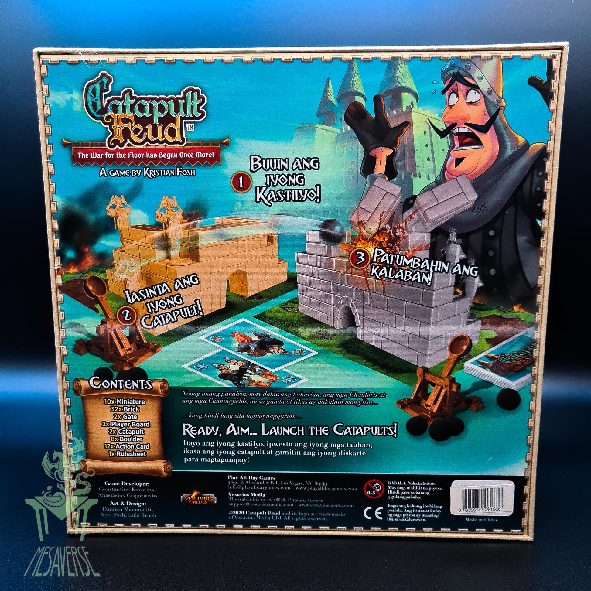 Starting with the youngest player, choose your family: Chaufort or Cunningfields. Then, use your bricks to build a castle to fortify your troops. Using your catapult, launch boulders in an attempt to destroy your opponent's castle and knock over their troops. When all troops of one family are knocked over, the battle is over. The winning family must have at least one troop standing upright.
