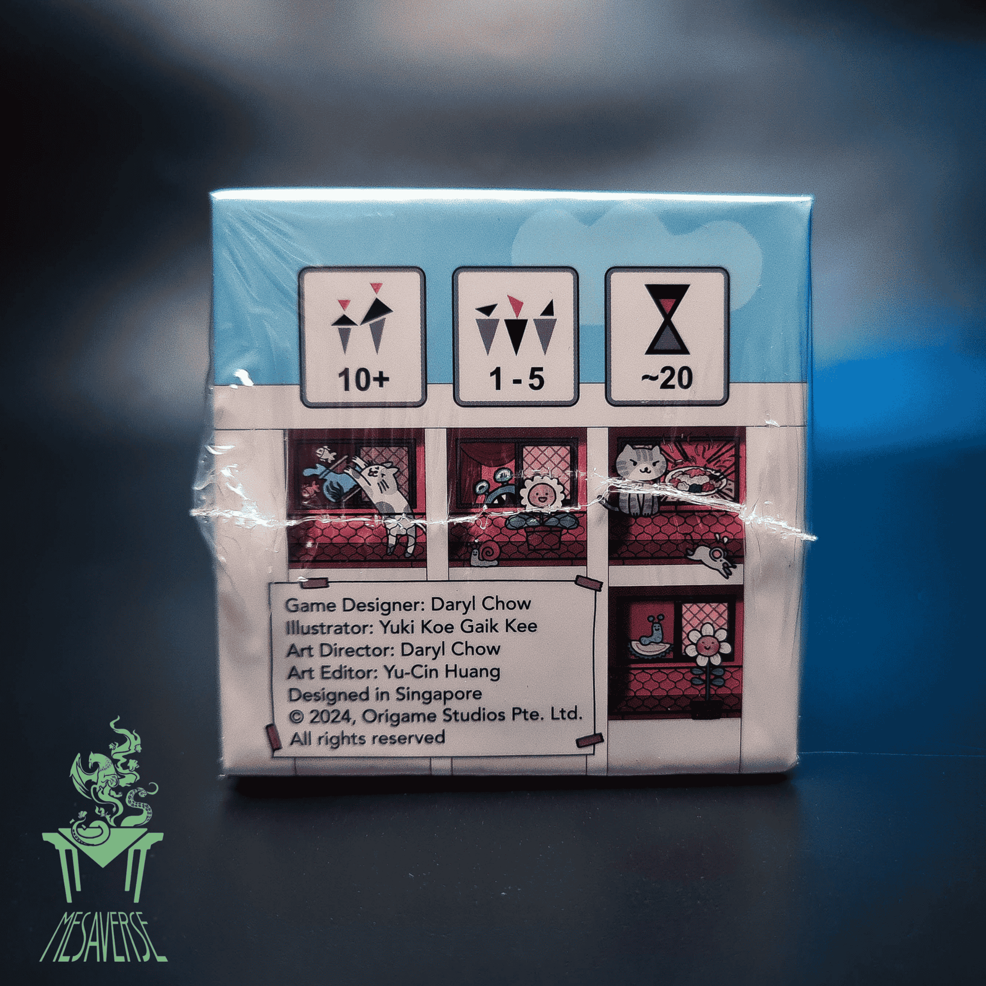 On your turn, place one of two double-sided block cards in hand into your apartment building. Make a block of four or more spaces of the same color — at lease one of which has a "For Rent" sign — and you can take a neighbor on display and add it to the block. Neighbors don't have a color, but they have a pair of features, some combination of cats, flowers, birds, and underwear. You'll find these features in other rooms, too, and if you make a chain of 6/8/10 of the same feature, claim a matching scoring token. As soon as everyone has finished a 4x3 building, count your points from scoring tokens and unscored chains of at least four features.