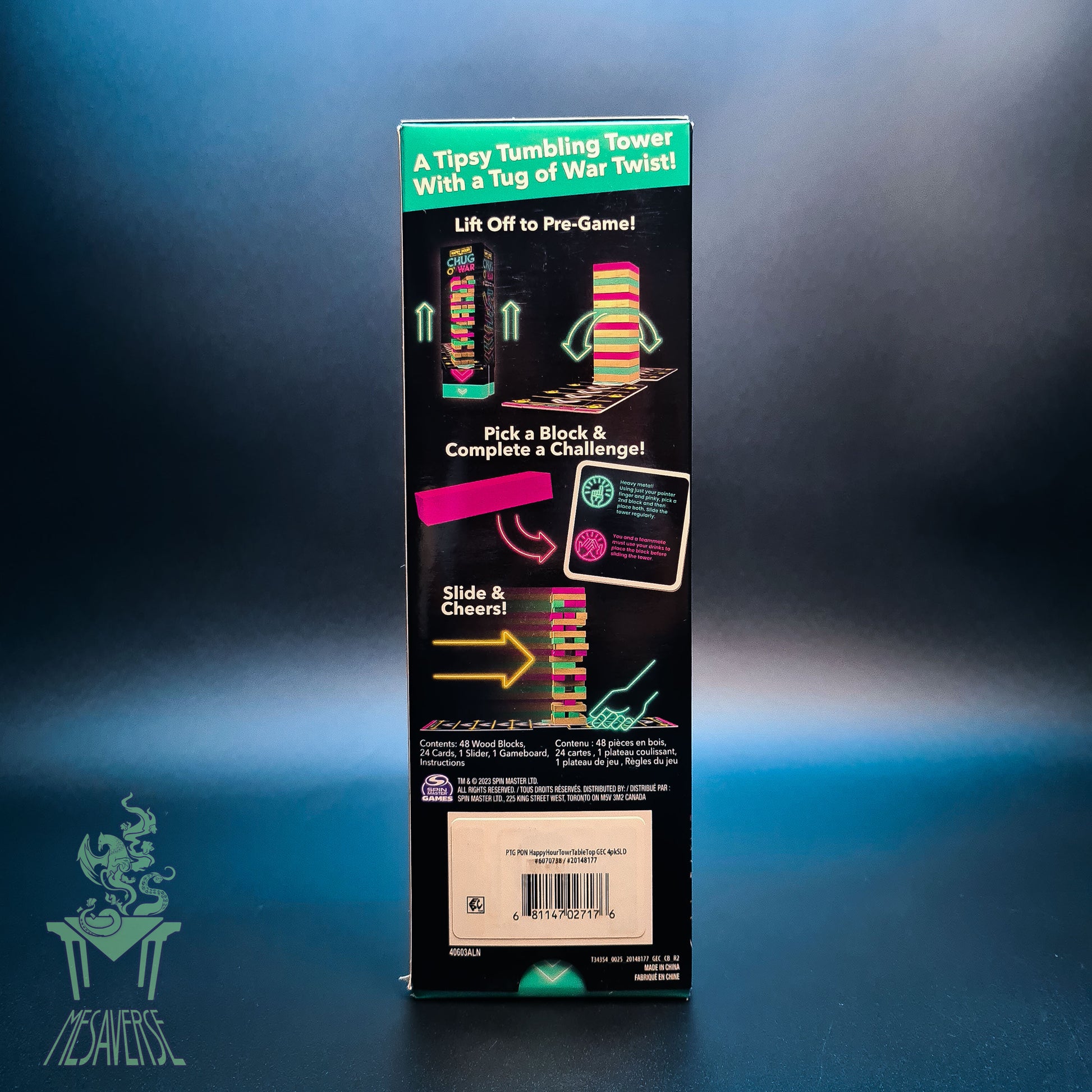 AKE ON THE TIPSY CHALLENGE: Carefully pull out and stack wooden blocks corresponding with hilarious challenge cards that go from easy to hard depending on the color Choose any beverage you like to play