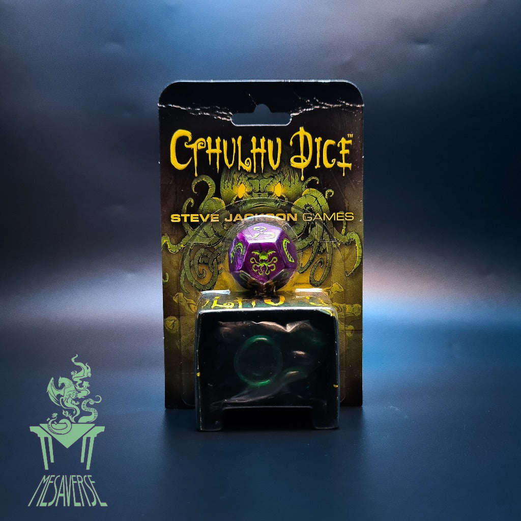 Cthulhu Dice lets you drive your rivals mad... Very, very quickly. Players take turns rolling the big, beautiful, custom 12-sided die, embossed with tentacles, Elder Signs, and more. Destroy your opponents' sanity! Better yet, steal it. But watch out for Cthulhu – when he comes up, he takes sanity from everyone! Eighteen glass Sanity marbles are included. Lose all your marbles and you're mad. The last sane cultist wins... Unless everyone goes mad together. Then Cthulhu wins!