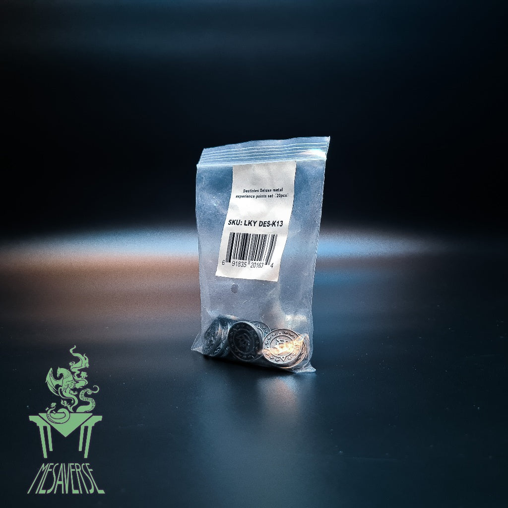 Truly feel the weight of your choices in the game with these upgraded coins. These 28 metal coins are 20mm wide and 2mm thick. They are in keeping with the dark medieval French theme of Destinies.