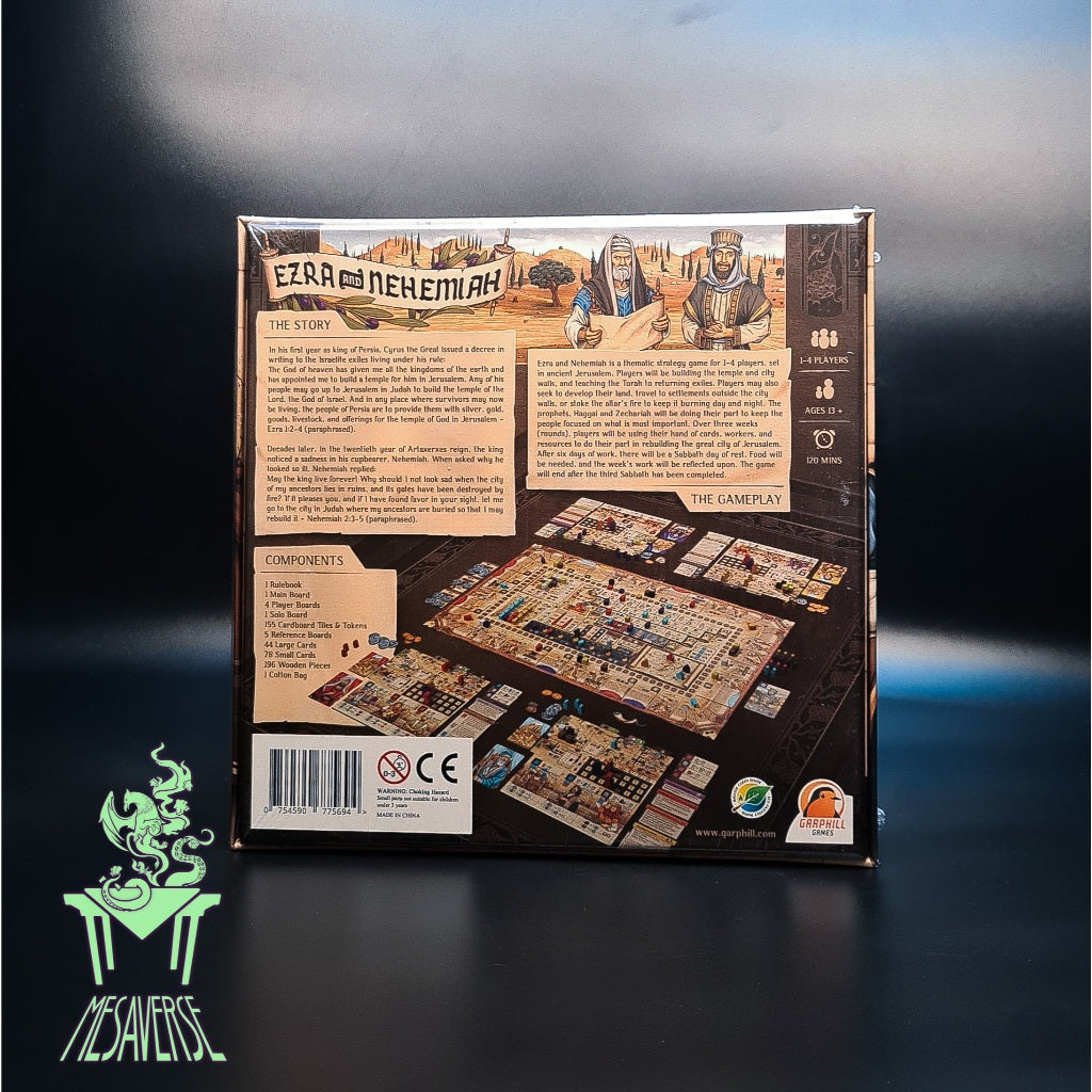 The aim of Ezra and Nehemiah is to be the player with the most victory points (VP) at game's end. Points are gained primarily by building the temple, rebuilding the city walls and gates, and by teaching the Torah to the returning exiles. Players may also seek to develop their land, travel to settlements outside the city walls, or stoke the altar's fire to keep it burning day and night. The prophets Haggai and Zechariah will be doing their part to keep the people focused on what is most important.
