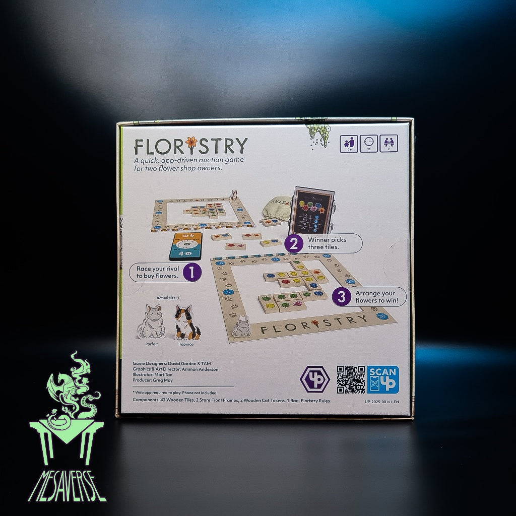 Floristry is a 2 player, tile-laying game. Players compete at the historic Aalsmeer Dutch Auction to win the best flowers and then use them to create the most charming window display.