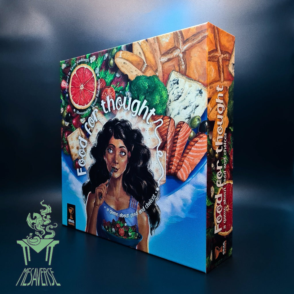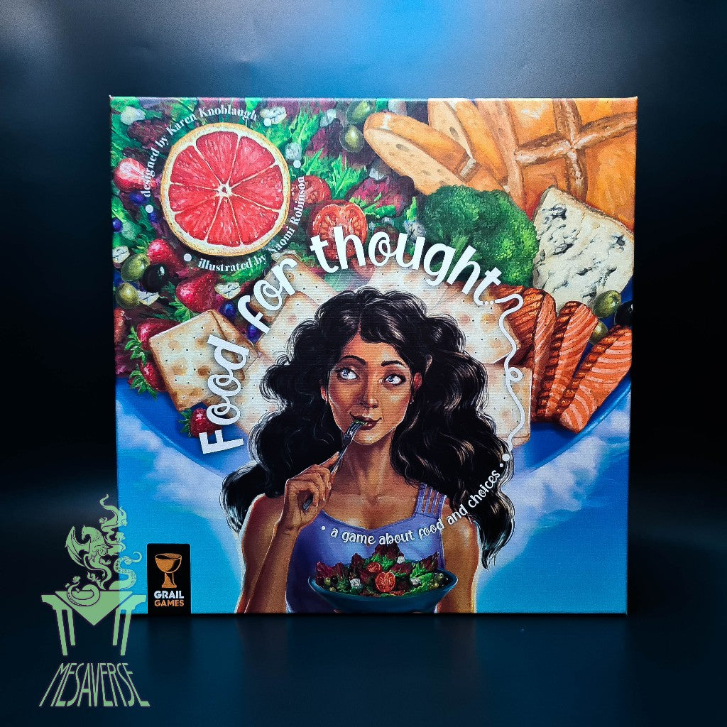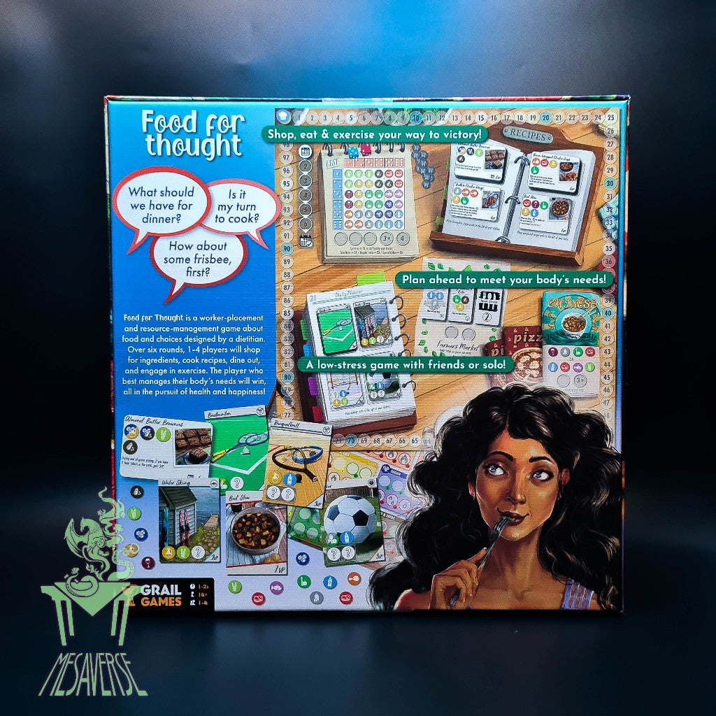 Food for Thought is a worker-placement and resource-management game designed by a dietitian. Over six rounds, players shop for ingredients, cook recipes, dine out, and engage in activities — shop, cook, dine out and exercise! The player who best manages their body's needs will win, all in the pursuit of health and happiness.