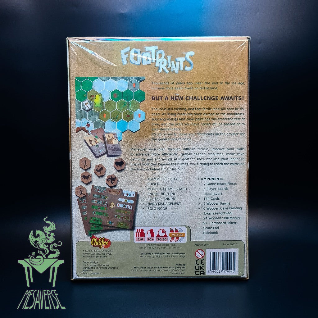 Footprints is a competitive game with asymmetric player powers (each player has their own clan deck) and variable setup through a modular game board. Your abilities in route planning, skill improvement (engine building), and hand management will increase your chances of winning the game.