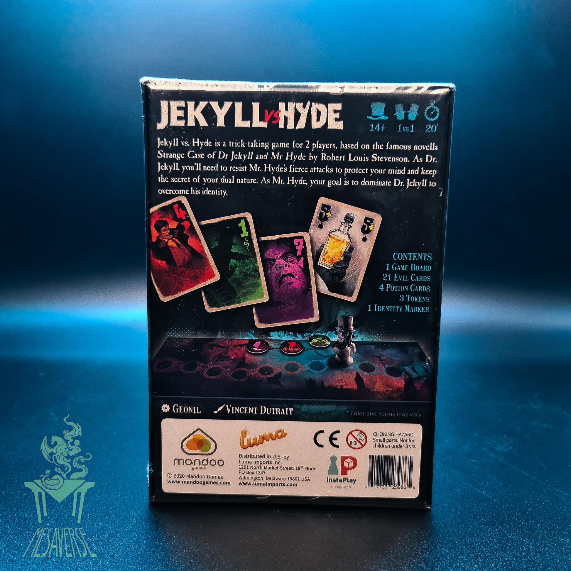 Jekyll vs. Hyde is a trick-taking game for two players based on the famous novella Strange Case of Dr. Jekyll and Mr. Hyde by Robert Louis Stevenson. As Dr. Jekyll, you'll need to resist Mr. Hyde's fierce attacks to protect your mind and keep the secret of your dual nature. As Mr. Hyde, your goal is to dominate Dr. Jekyll to overcome his identity.