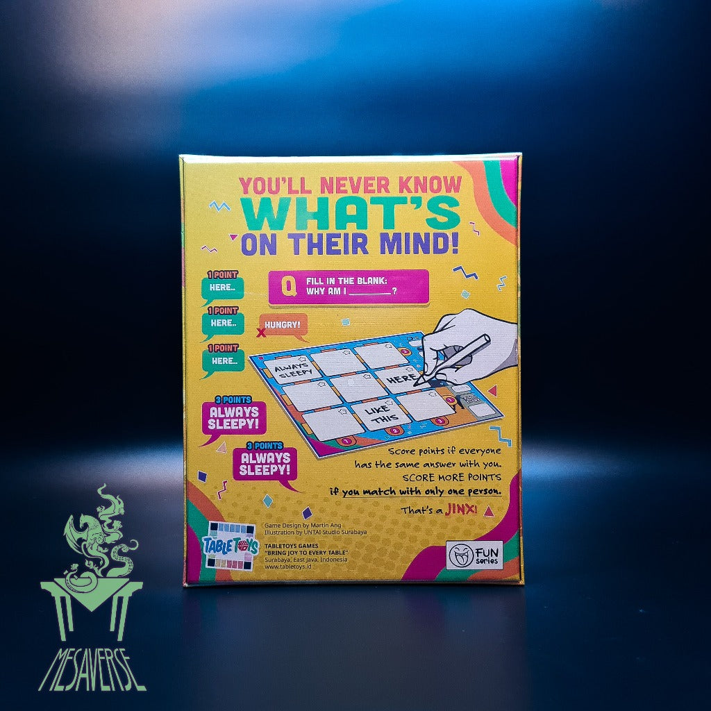 The aim: to score the most points by writing down answers that matches other people in the group. Be careful with your words! If your answer doesn't match anybody in the group, you jinxed it and receive no points. However, if only one other person matches with you, you score more points - it's a JinxO!