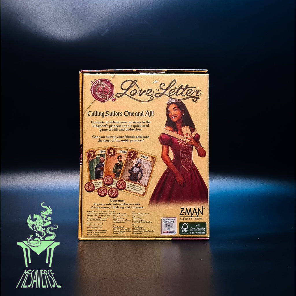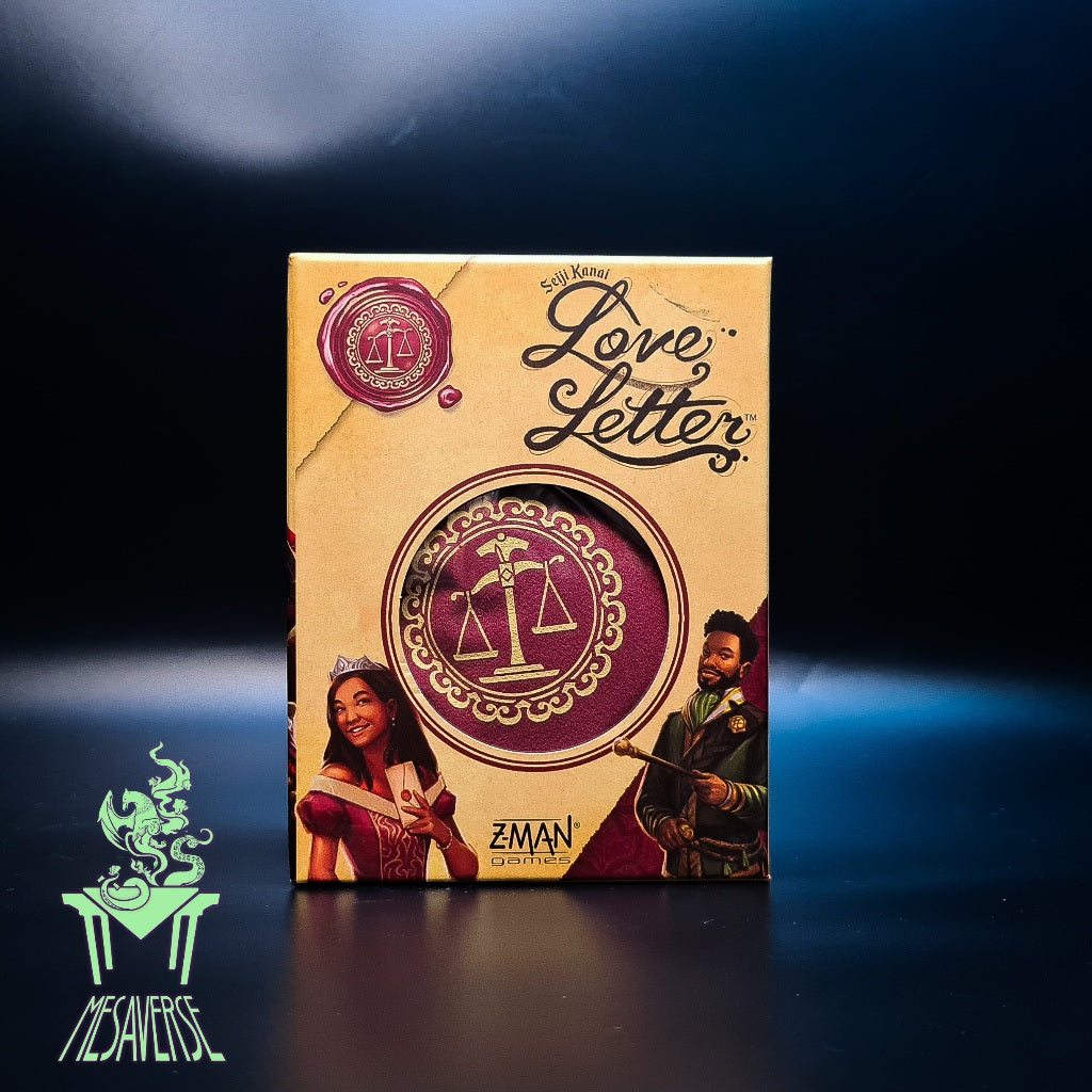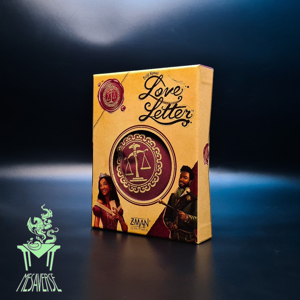 Love Letter is a game of risk, deduction, and luck for 2–4 players. Your goal is to get your love letter into Princess Annette's hands while deflecting the letters from competing suitors. From a deck with only sixteen cards, each player starts with only one card in hand; one card is removed from play. On a turn, you draw one card, and play one card, trying to expose others and knock them from the game. Powerful cards lead to early gains, but make you a target. Rely on weaker cards for too long, however, and your letter may be tossed in the fire!