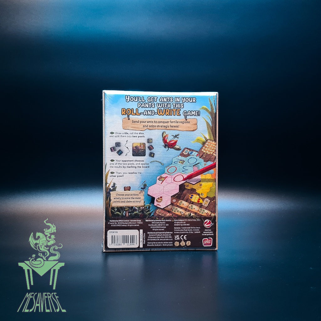Each player controls a colony of ants in Marabunta. On a turn, the active player rolls the six dice, then splits them into two groups. The opponent chooses and uses the dice in one of the groups, then the active player uses the remaining dice.