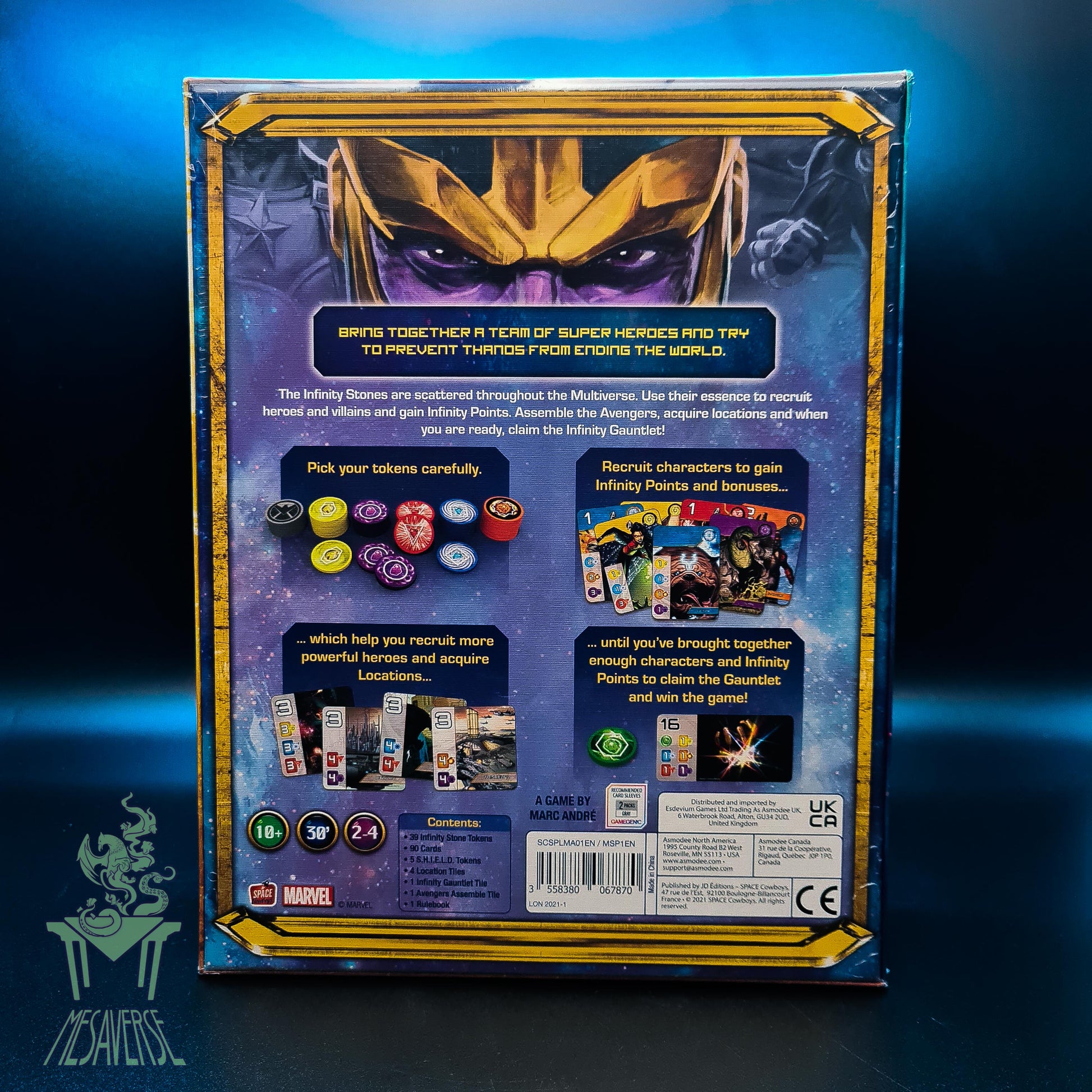 Pick your tokens carefully, recruit characters to gain Infinity Points and bonuses. These bonuses help you recruit more powerful heroes and acquire locations… until you gather enough characters, power, and Infinity Points to trigger the endgame!