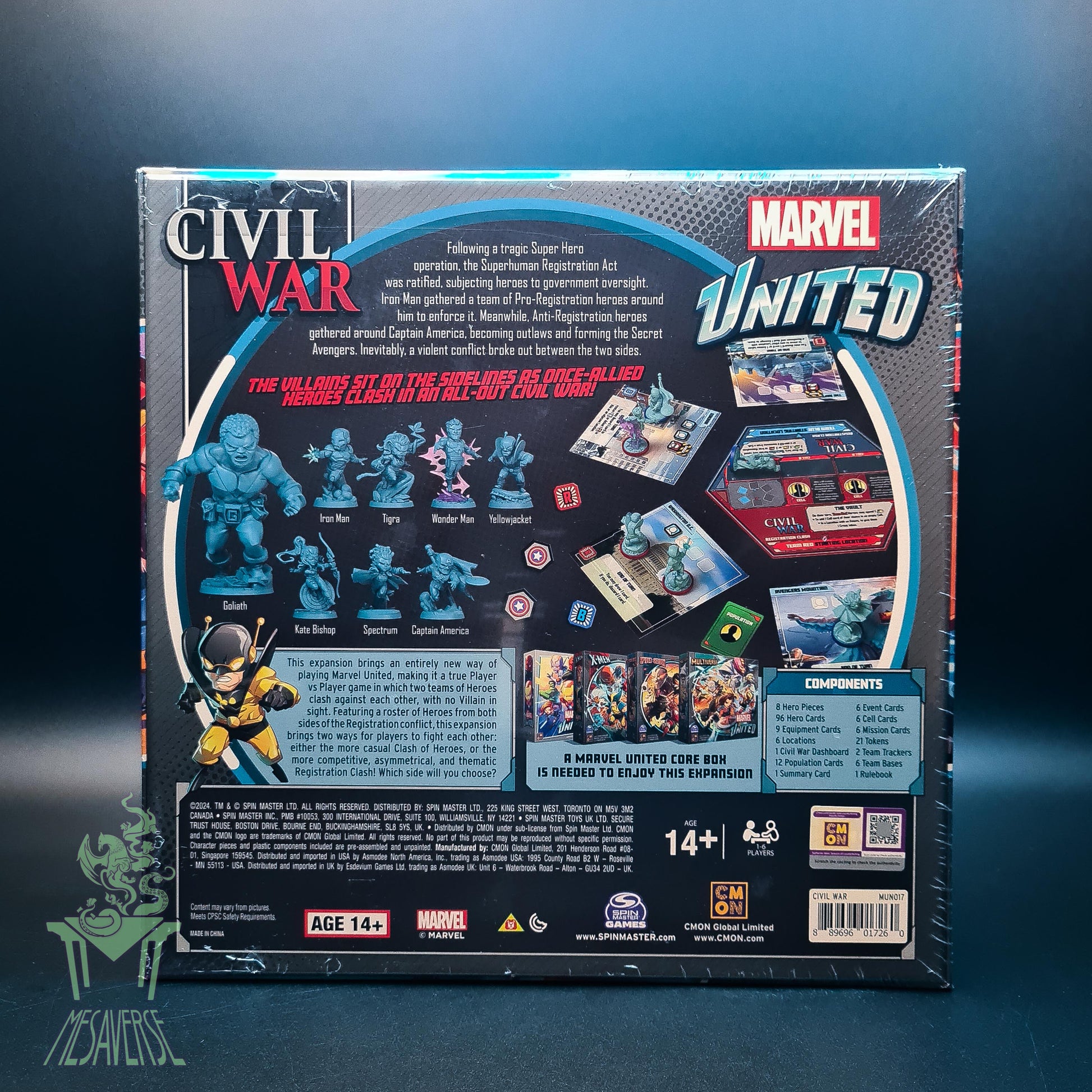 This expansion brings an entirely new way of playing Marvel United! The Civil War play modes make it a true Player vs Player game, in which two teams of Heroes clash against each other, with no Villain in sight. Featuring a roster of Heroes from both sides of the Registration conflict, this expansion brings two ways for players to fight each other: either the more casual Clash of Heroes, or the more competitive, asymmetrical, and thematic Registration Clash! Which team will you choose?