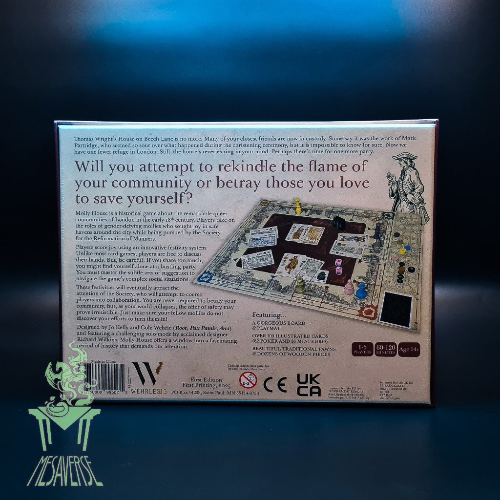 Players draft hands of vice cards representing the different gestures, desires, and encounters that were frowned upon by the Society for the Reformation of Manners, a citizen group that sought to stamp out any behavior it deemed deviant in late 17th and early 18th century London. These cards allow players to host festivities with the help of their fellow mollies and create joy. But, those same cards can also lead players to be arrested and to the ultimate ruin of the molly house.