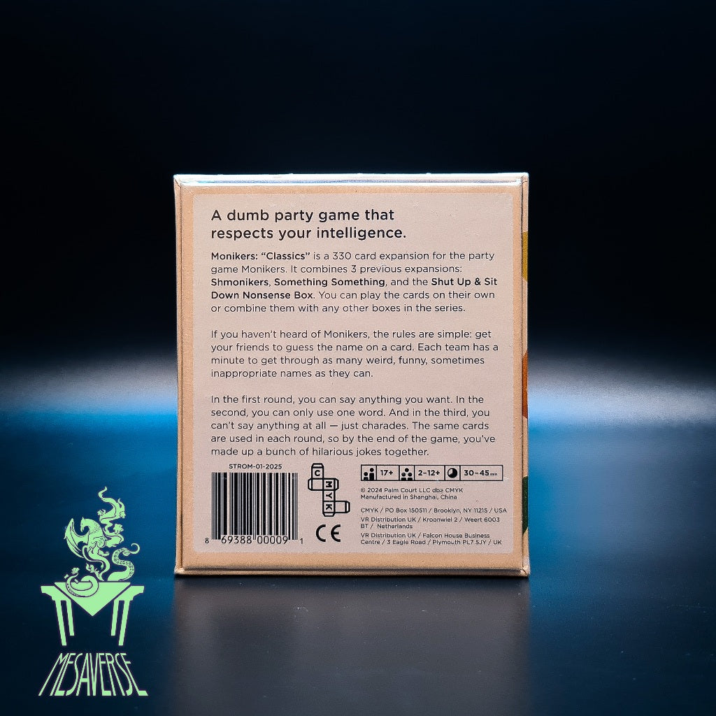 Monikers: Classics - This box combines all the previous small box stand alone expansions: Monikers: Shmonikers, Monikers: Something Something, and Monikers: The Shut Up & Sit Down Nonsense Box
