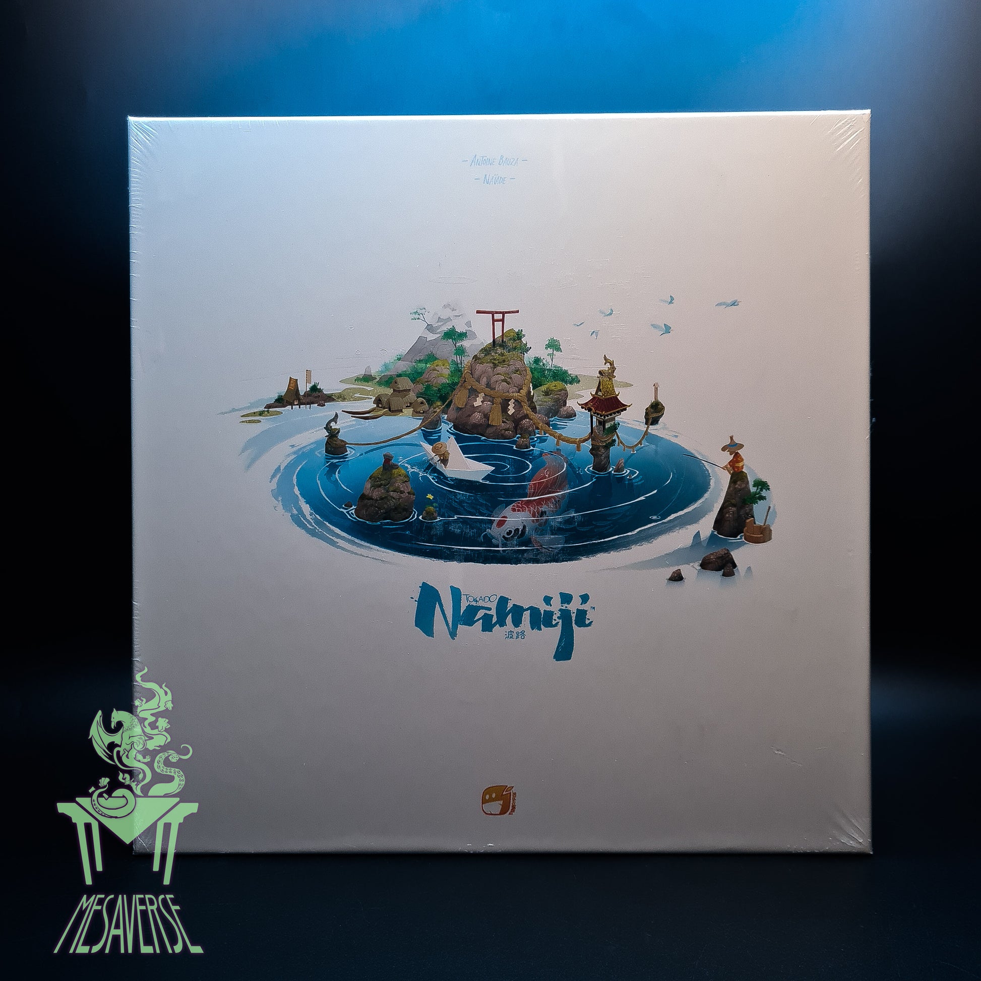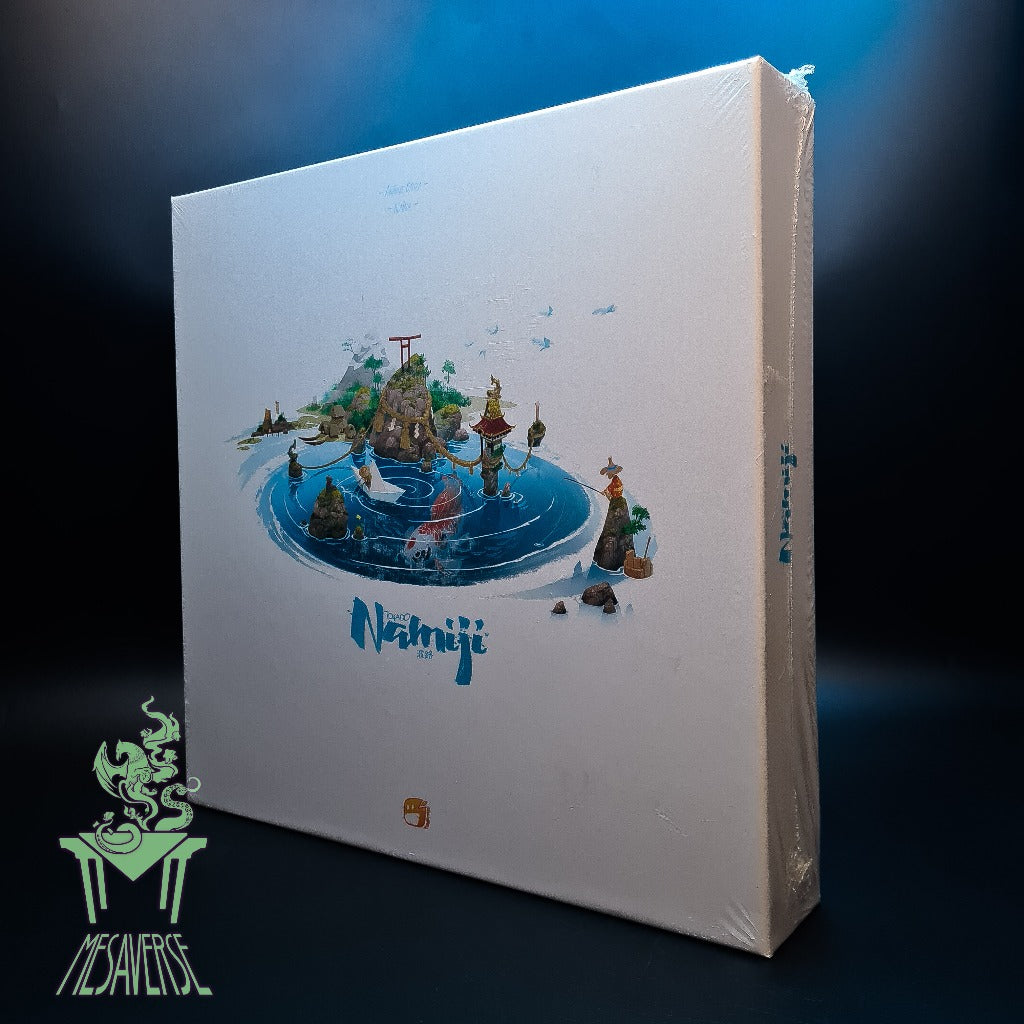 In Namiji, you are fishers from the Japan of yesteryear, navigating south of the Japanese archipelago, a few kilometers from the famous Tokaido road. You will need to have a fruitful day at sea to win the game. To do this, you will have the opportunity to contemplate magnificent marine species, to fish with a line or a net to fill your racks with colorful fish, and haul in your crustacean traps. You can benefit from stops to improve your fishing equipment, and you will also have to contend with the gods of the sea by setting offerings afloat, or by fulfilling their wishes that they express during your contemplation with the Sacred Rocks, for which they will reward you. Namiji features gameplay similar to Tokaido. The action spaces are laid out on the game board in a linear track, with players advancing down this track to take actions. The player who is currently last on the track takes a turn by advancing forward on the track to their desired action and taking that action, so players must choose whether to advance slowly in order to get more turns, or to travel more rapidly to beat other players to their desired action spaces. What players are doing on the track differs from what they do in Tokaido.