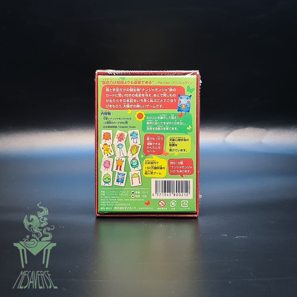 a specific edition of the popular Japanese card game Nanja Monja, featuring whimsical, colorful monster characters, often sold in "green box" versions with unique characters, focusing on fast-paced naming and matching for family fun, unlike the character Midori from Ensemble Stars or related food/toy items. The game involves players quickly identifying and shouting the names of randomly appearing creatures, testing memory and reaction time in a simple, chaotic party game style.