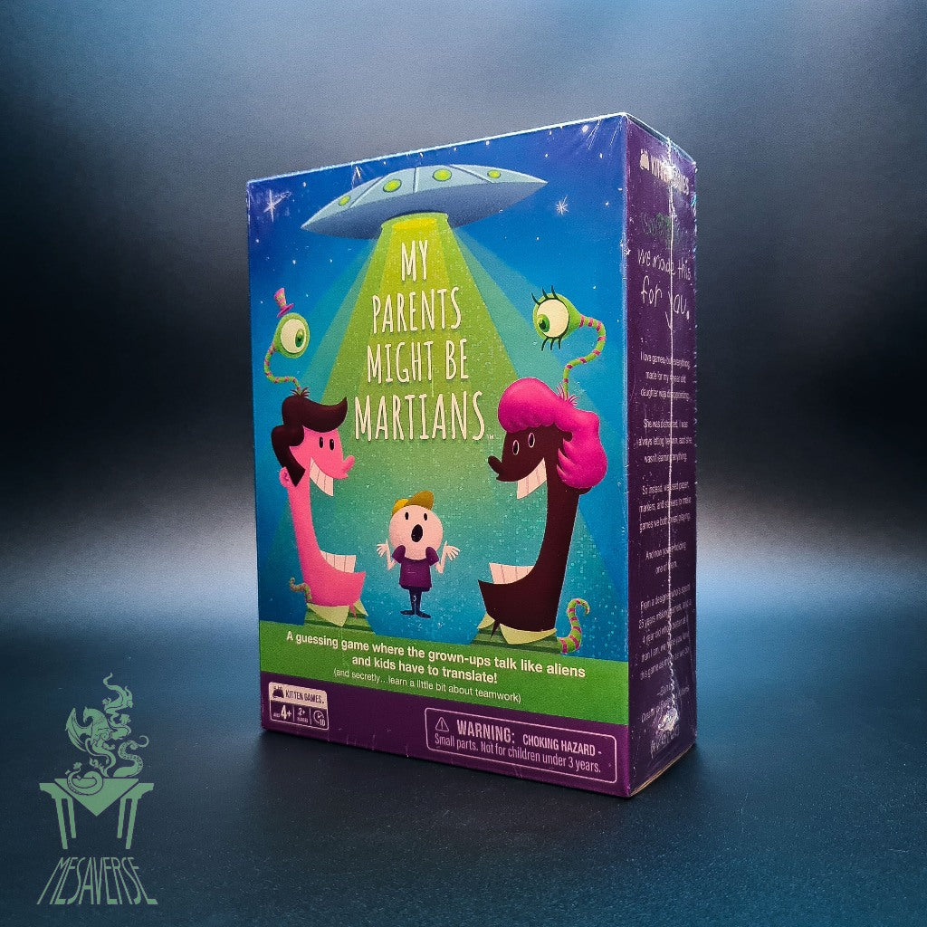 My Parents Might Be Martians plays like a junior version of Poetry for Neanderthals as adults must describe a hidden word to the kids' team using only one-syllable clues. Adults end up sounding like they're from another planet, while kids try to interpret the adults' clues and guess the correct words.