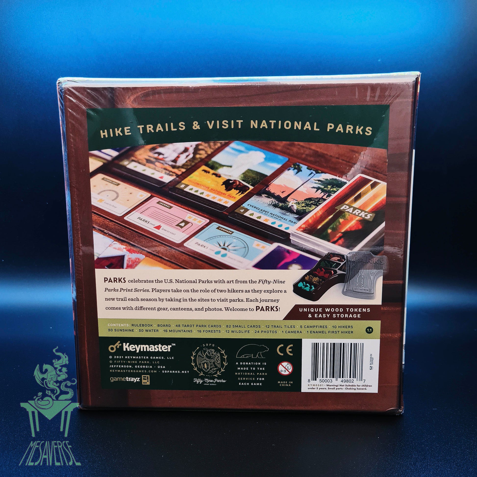Play solo or with up to 5 players Includes 48 unique illustrations featuring 45 US National Parks, built in box organization, wooden wildlife and resource tokens.