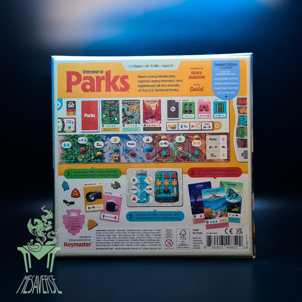 This expanded, enhanced second edition of the best-selling game features all-new illustrations by artists Josh Emrich and Lisk Feng, offers new gameplay elements from designer Henry Audubon, and incorporates the most interesting ideas from each of the Parks games and expansions: the additional camping module from Parks: Nightfall, the animal integrations from Parks: Wildlife, and a comprehensive selection of players’ favorite gear, challenges, and mechanics from the five-year history of Parks (along with some new surprises).