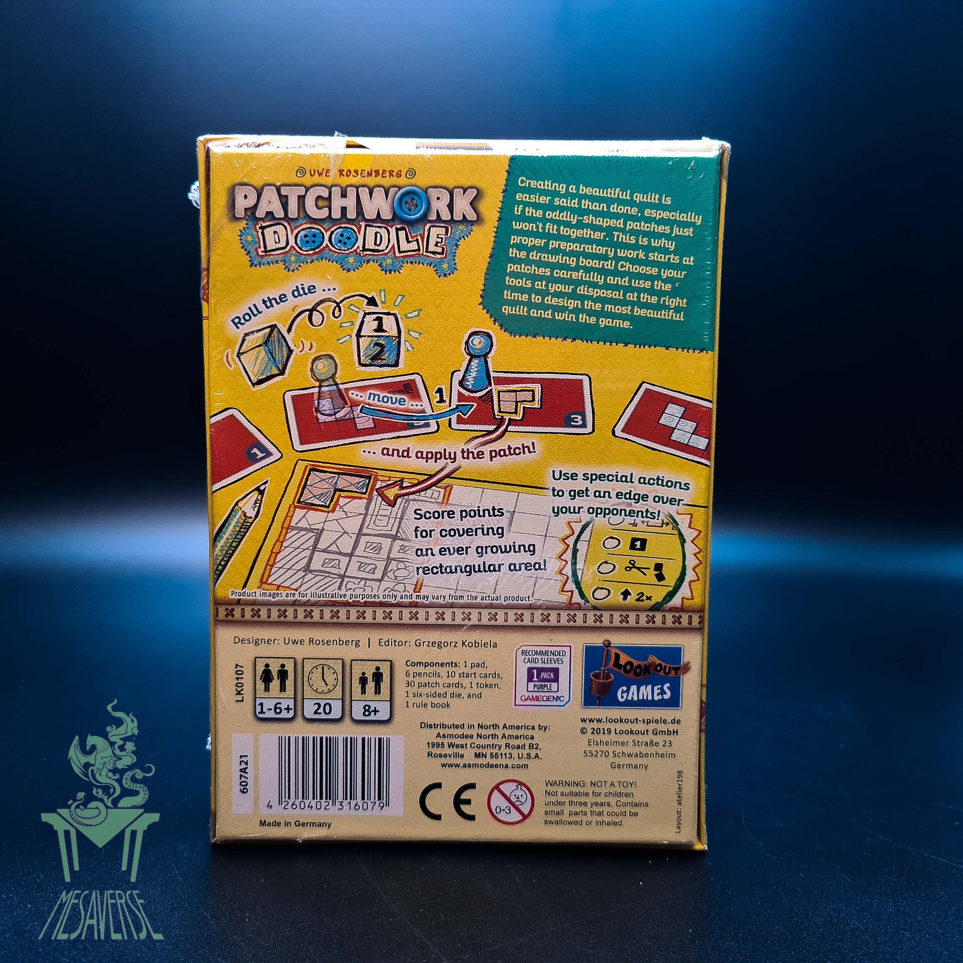 Number of Players: 1-6 Patchwork Doodle is a roll-and-write version of Patchwork, with each player having their own 9x9 grid to fill in over the course of the game. Each player sets up by drawing a unique polyomino card from the starting deck, then drawing that on their sheet.