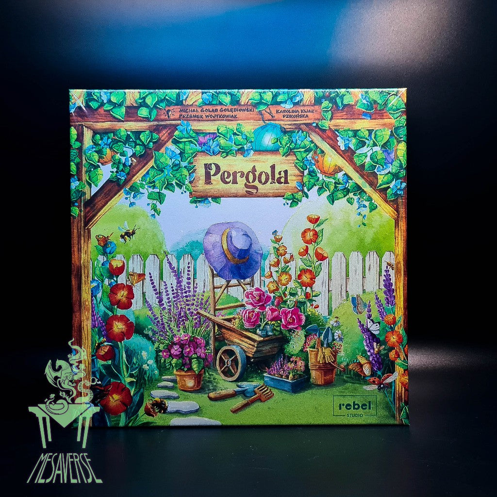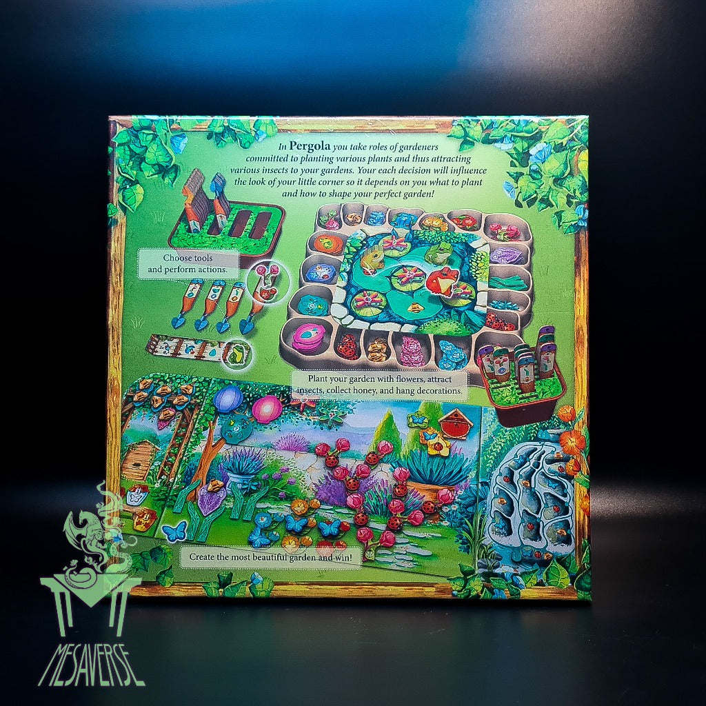 In Pergola, players develop their gardens, grow new plants, and attract insects and small animals. On their turn, a player chooses one of the four available tools, picks the presented items, and arranges them in their garden. Then they perform the action corresponding to the chosen tool. Since players have a lot of freedom in arranging plants in their gardens, after fifteen rounds each garden looks completely different and scores differently. The player who accumulates the most points wins.