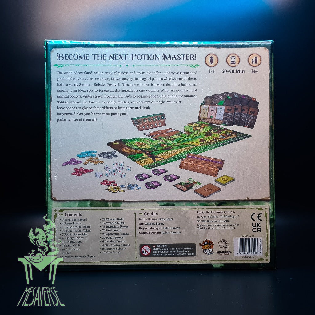 Potions of Azerland utilizes a unique simultaneous action selection mechanism where understanding the goals of your opponents in each round will give you the upper hand. Decide whether to drink your newly made potions for temporary boosts and prolonged powers or give them to an ever changing group of travelers for points and other bonuses. After 6 rounds the player who has garnered the most prestige will be the winner!