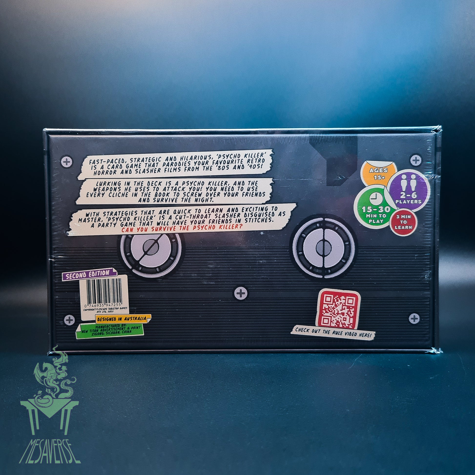 In the deck, there are 5 cards for the psycho killer and cards for the weapons he uses to attack you. Your turn consists of playing as many cards as you like from your hand but must end by you drawing a card from the top of the deck. However, you do not need to play a card to draw from the deck. If someone draws a Psycho Killer card they must play it on the table in front of them, unless they can evade the Psycho Killer. If they cannot, every player with a weapon card in their hand gets attacked. When attacked, players must place their Weapon cards face up on the table in front of them. These are called Injury Piles. Each Psycho Killer and Weapon card is worth a certain amount of points. When they are added to your injury pile they become Injury Points. The game ends when the last Psycho Killer card is drawn and the player with the lowest amount of injury points wins. Psycho Killer satirises your favourite retro horror and slasher films. Use every cliche in the book to screw over your friends and survive the Psycho Killer!