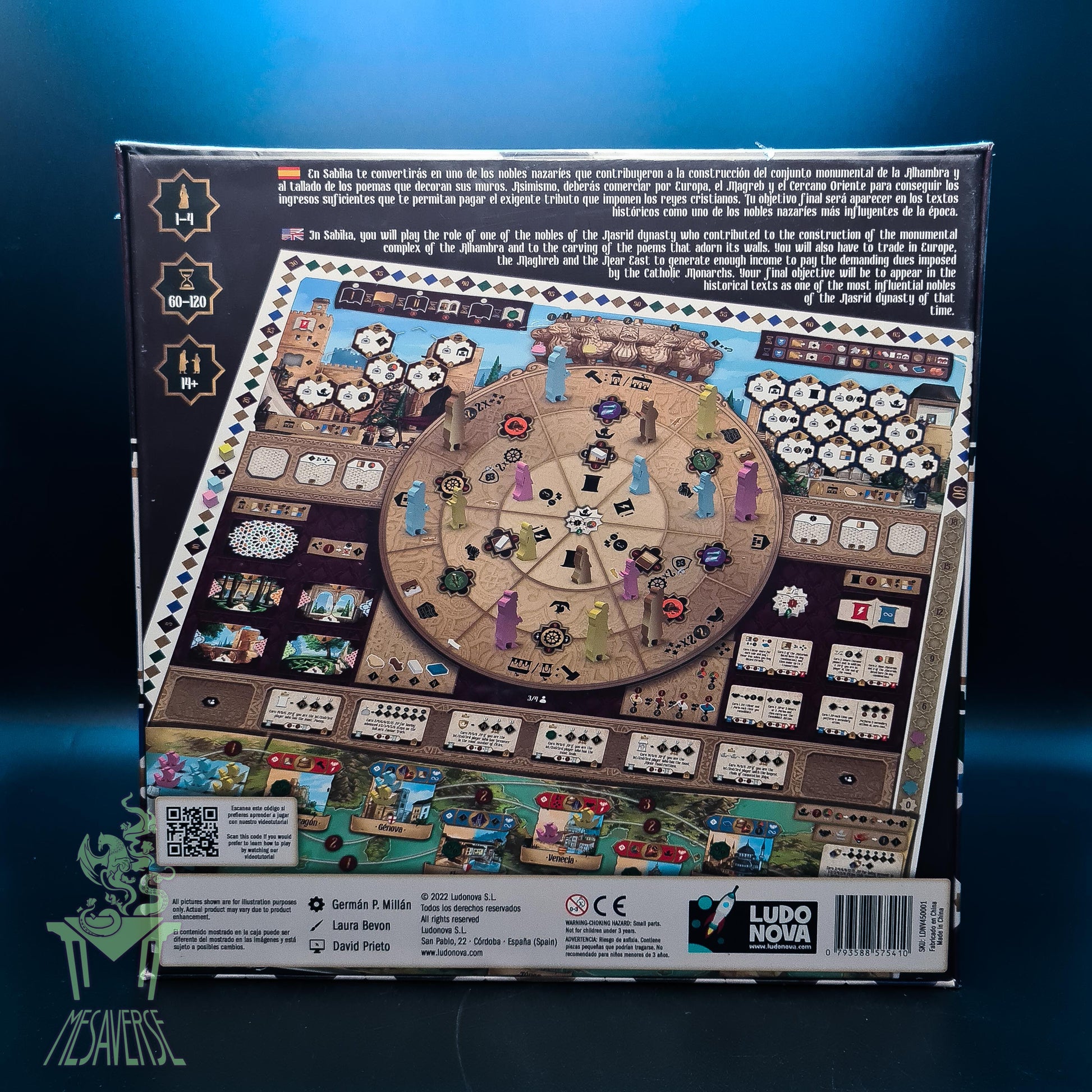 Sabika implements a novel mechanism that integrates three interrelated rondels. Each rondel focuses on a different scenario: the construction of the Alhambra, the carving of poems in its halls, and the export of goods along the trade routes. All of this takes place over five eras (rounds), and at the end of the fifth round, the player who has accumulated the most prestige points takes the victory.