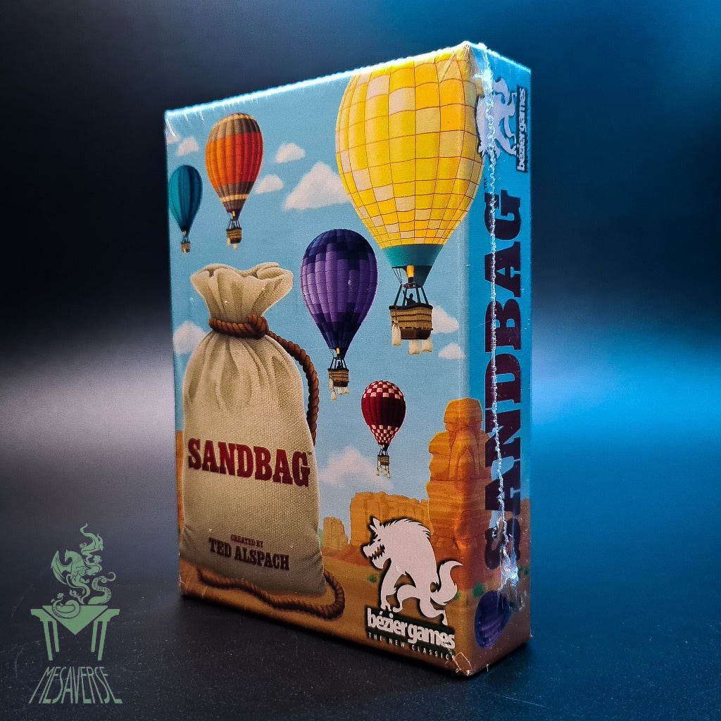 Sandbag is a trick-taking game of avoiding tricks, manipulating trump, and reconfiguring your hand of cards. In each of the three rounds, you configure your basket with two face-up cards; the most common color among all players' cards is the trump suit. Each trick, players either play from their hand, play a sandbag (to sluff, that is avoid winning the trick), or play one of their opponents' face-up cards. During the round, it's possible for the trump to change as the number and kind of face-up cards are exchanged for face-down sandbags. Five rocket cards worth negative points are in play each round, and you want to win these while avoiding the sandbag cards because in the end the player with the lowest score wins.