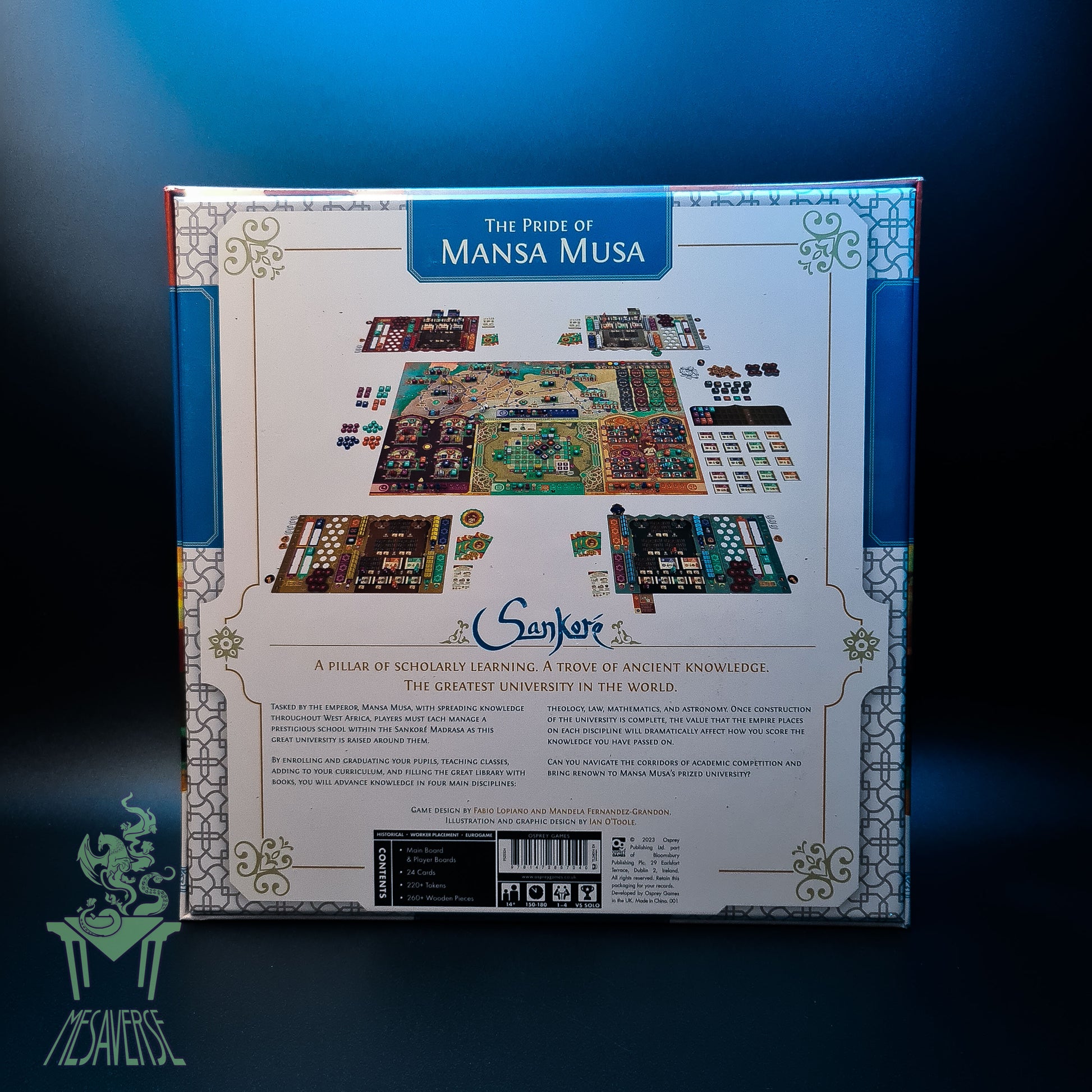 In Sankoré: The Pride of Mansa Musa, a dynamic, interactive, mid-weight Eurogame, 1-4 players manage the prestigious University of Sankoré in 14th-century Timbuktu, tasked by the emperor Mansa Musa with spreading knowledge throughout West Africa, even as the great university is raised around them.
