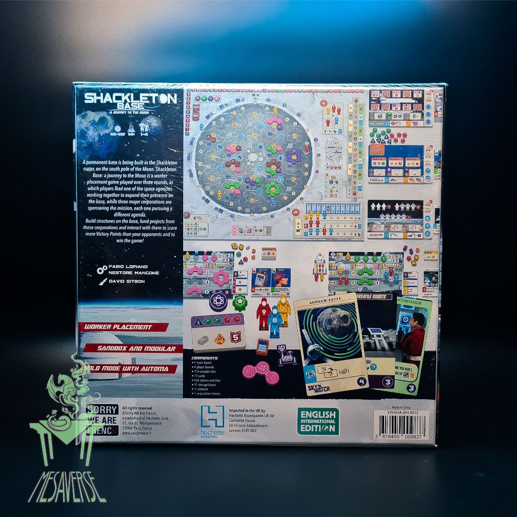 A permanent base is being built in the Shackleton crater at the Moon's South Pole. You're leading one of the space agencies that are working together to expand their presence on the base, while at the same time the three major corporations sponsoring the mission are each pursuing their own agenda. In Shackleton Base: A Journey to the Moon, you will build structures on the base, while also funding projects from the corporations that provide special abilities and scoring opportunities.