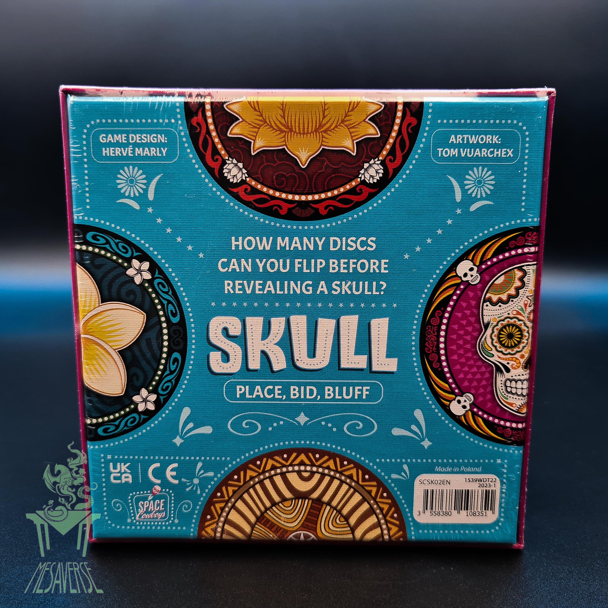 Skull & Roses is the quintessence of bluffing, a game in which everything is played in the players' heads. Each player plays a face-down card, then each player in turn adds one more card – until someone feels safe enough to state that he can turn a number of cards face up and get only roses. Other players can then overbid him, saying they can turn even more cards face up. The highest bidder must then turn that number of cards face up, starting with his own. If he shows only roses, he wins; if he reveals a skull, he loses, placing one of his cards out of play. Two successful challenges wins the game. Skull & Roses is not a game of luck; it's a game of poker face and meeting eyes.