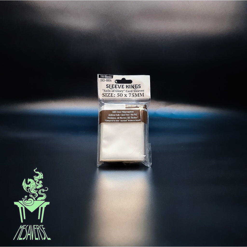 Sleeve Kings Premium 50x75mm card sleeves offer excellent value and protection, featuring a durable 60 micron thickness (thicker than most standard sleeves), 110 sleeves per pack (10% more than average), and made from Cleartech™ polypropylene for superior clarity and archival safety. They provide a snug but manageable fit for cards in games like Sails of Glory, ensuring protection from wear and spills while maintaining card visibility and ease of shuffling.