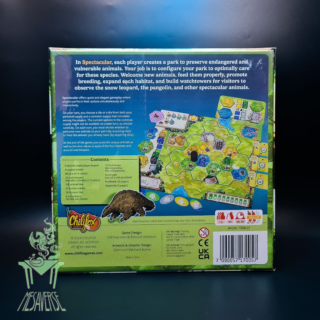 In Spectacular, you are creating and developing your own animal park for vulnerable species. In order to preserve the species, you must ensure breeding within each habitat. Spectacular provides simultaneous play and ensures interaction between the players, as your opponents’ decisions will affect which tiles and dice are available for you. The game also comes with asymmetric player boards (on their backs).