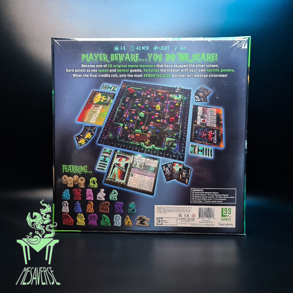 In Spooktacular, play as one of twenty movie monsters, each with their own way of playing the game. Easy to understand rules are the base of the game, and everything else you need to know is right on your monster board. Tons of variability and devious monster abilities to discover will keep you coming back to the theater.
