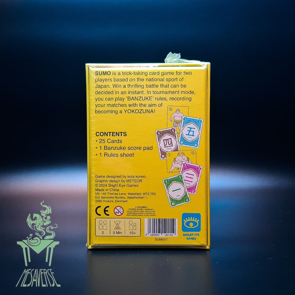 To set up, place the sumo wrestlers card in the center of the sumo ring. (The sumo ring has only three positions: left, center, and right.) One player sits on the left of the ring, the other on the right. Deal each player a hand of eight cards from a deck that contains 20 cards: 1-5 in four suits.