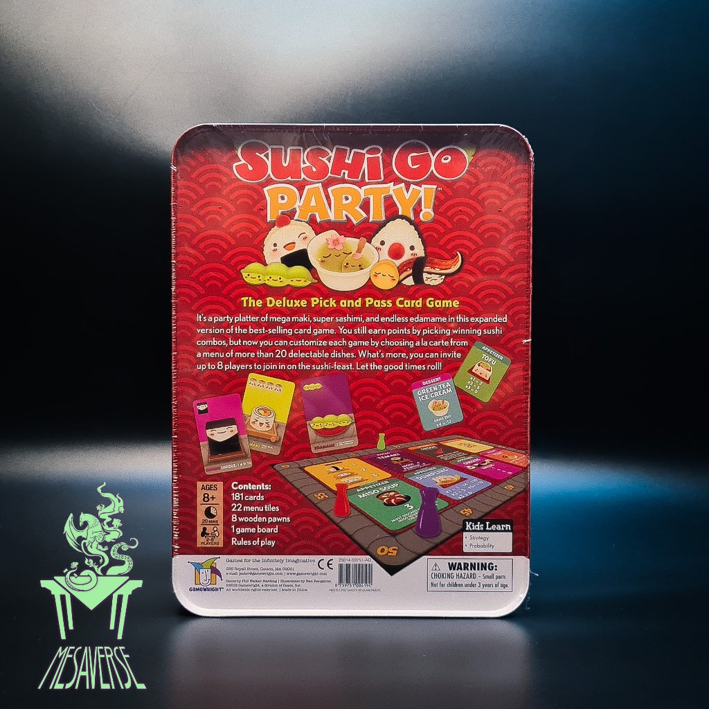 Sushi Go Party! expands Sushi Go! with a party platter of mega maki, super sashimi, and endless edamame. You still earn points by picking winning sushi combos, but now you can customize each game by choosing à la carte from a menu of more than twenty delectable dishes. What's more, up to eight players can join in on the sushi-feast. Let the good times roll!