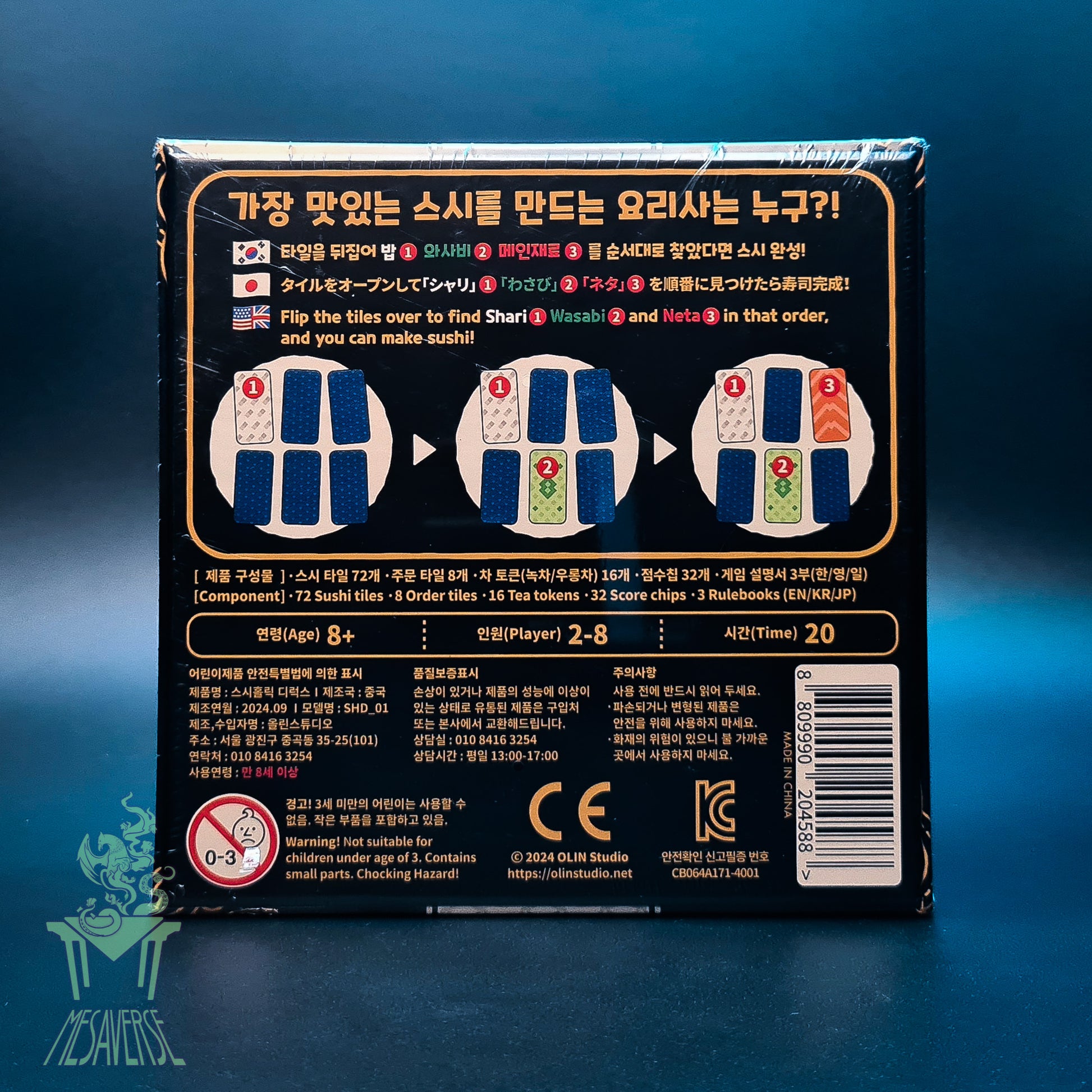 To play the game, first place all the 40 tiles face down on the table. The starting player chooses one tile and turns it over. If he/she succeeds in turning the rice-wasabi-material tile in order, one sushi is completed and the three tiles are taken by the player. If one of them fails, the turn is immediately passed on to the next player. If you turn over a green tea tile, take that tile and turn over another tile again. The obtained green tea tile can be used to inspect another tile at any time during the player's turn. When one player completes the number of sushi set according to the number of people, one round ends, and the person who earned the specified goal round score first wins the game.