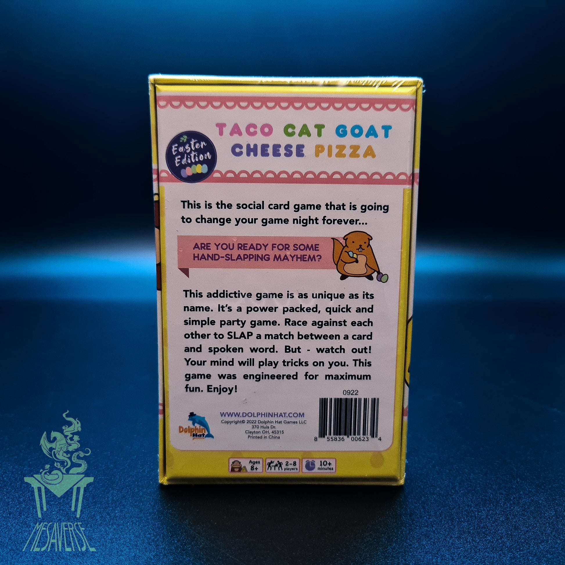 Taco Cat Goat Cheese Pizza: Easter Edition is filled to the brim with hand-slapping mayhem! As in Snap and Dobble, each player places a card from their hand face up into a community pile while saying taco/cat/goat/cheese/pizza in player sequence. When the card matches the mantra — boom! — everyone slaps their hand on the deck, with the last one to slap picking up the cards. Whoever rids themselves of cards first wins!