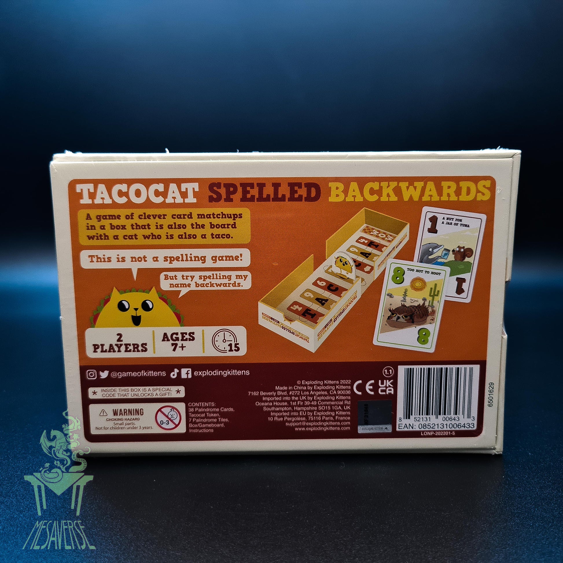 Tacocat Spelled Backwards is a fun balance of strategy, luck and instinct! With its portable open-and-play design, it's a perfect two player anytime, anywhere game; the box is the board, just open and play!