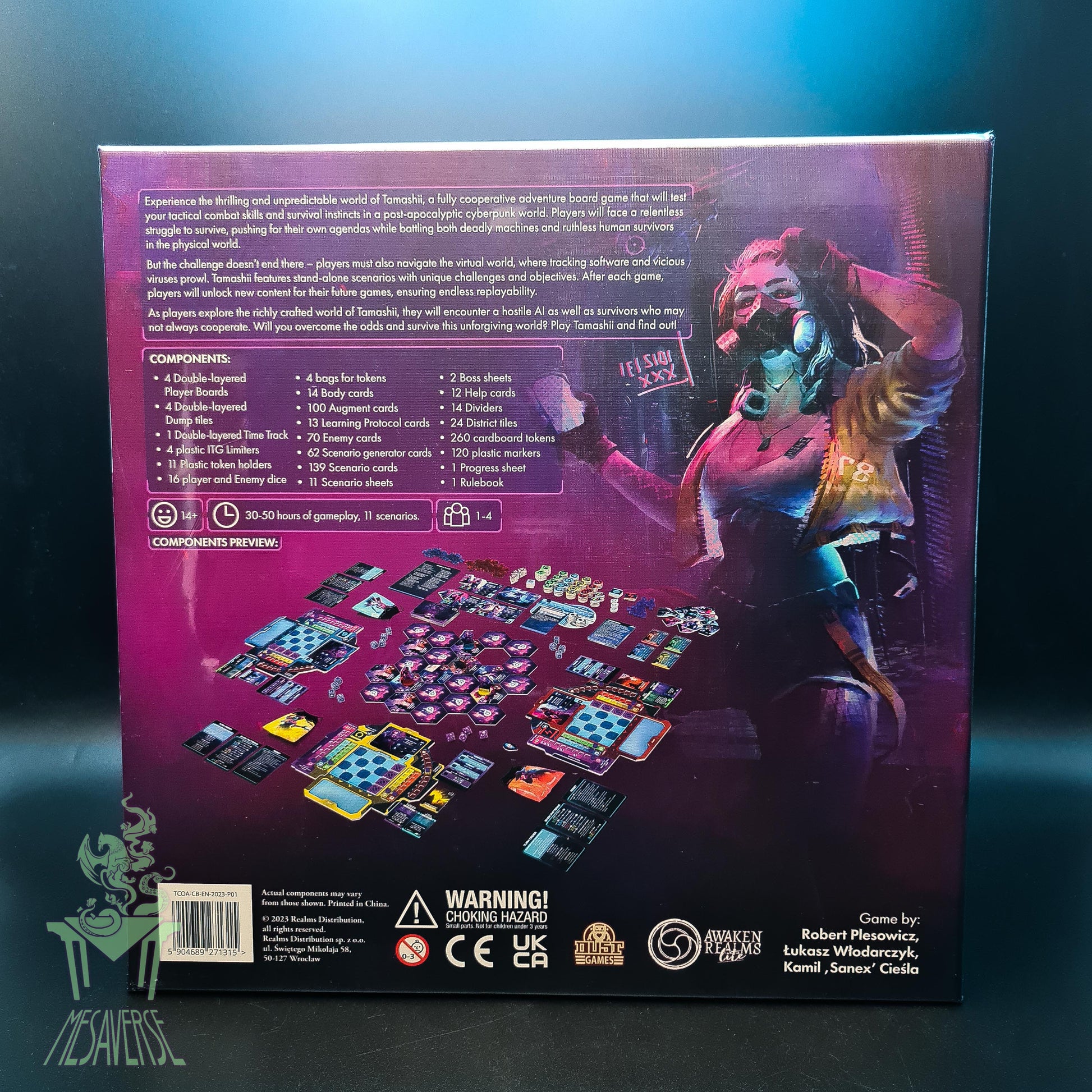 Tamashii is a cyberpunk adventure board game with a post-apocalyptic vibe. Players will struggle to survive and pursue their agendas in two worlds at the same time - the physical one, filled with deadly machines and merciless human survivors, and the virtual one, prowled by tracking software and vicious viruses.