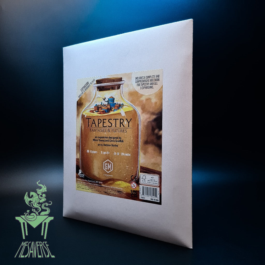 Fantasies & Futures is fully compatible with any combination of the core game, the other Tapestry expansions, and the natural rubber playmat. It is packaged in an eco-friendly, recyclable envelope.