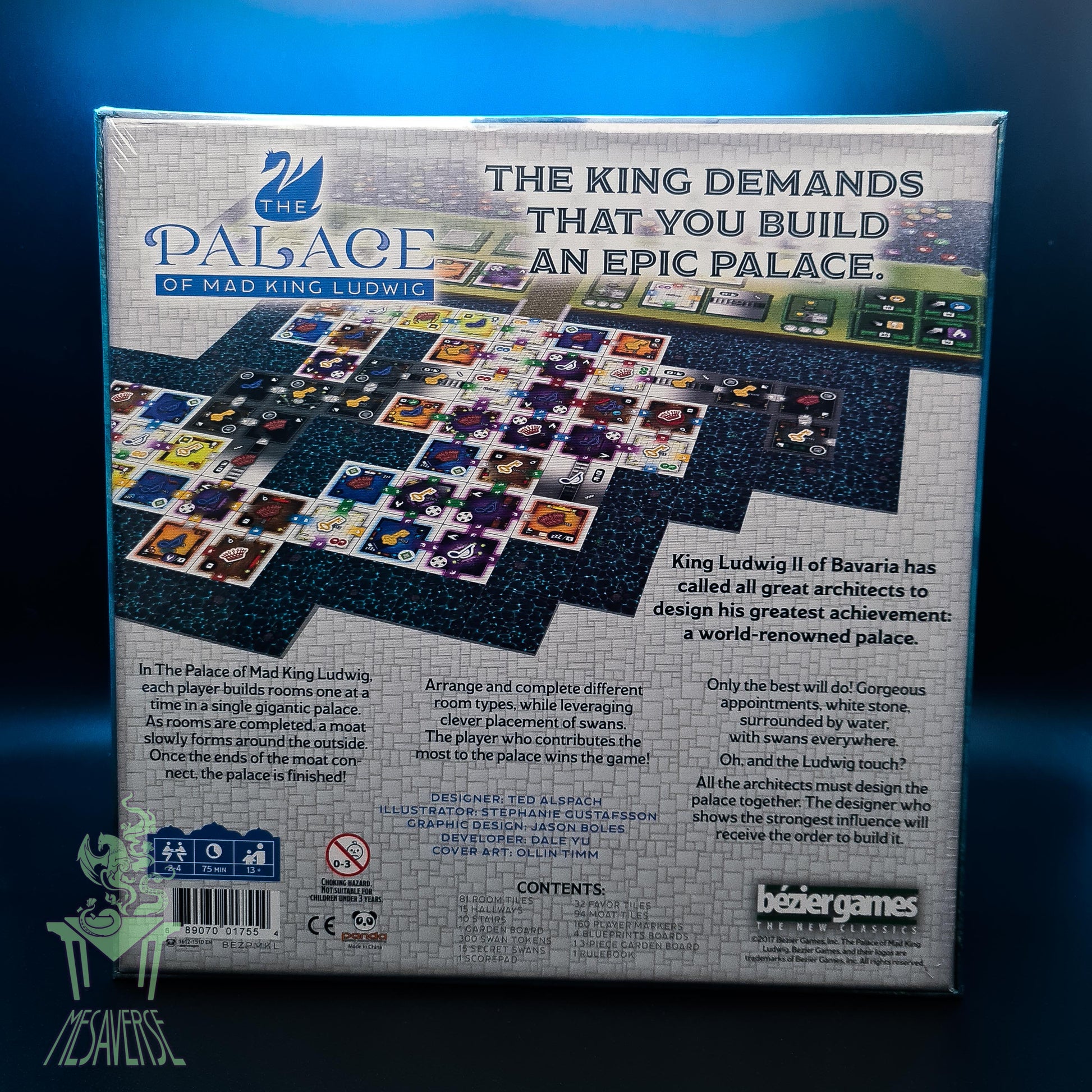 In The Palace of Mad King Ludwig, each player builds rooms one at a time in a single gigantic palace. As rooms are completed, a moat slowly forms around the outside. Once the ends of the moat connect, the palace is finished, and the player who has contributed the most to the palace wins!