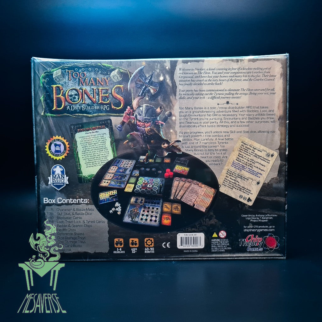 Loaded with content for solo and coop play, Too Many Bones comes with 136 custom dice, beautiful edge-stitched neoprene mats, PVC cards and dozens of high quality chips. The seven Tyrants employ their own special encounters and a unique final battle that will put all your skills to the test. Each of the four Gearlocs come with 21 custom dice, numerous character build options and completely unique gameplay mechanics and skills. This a game you’ll bring back to the table to try something new again and again.