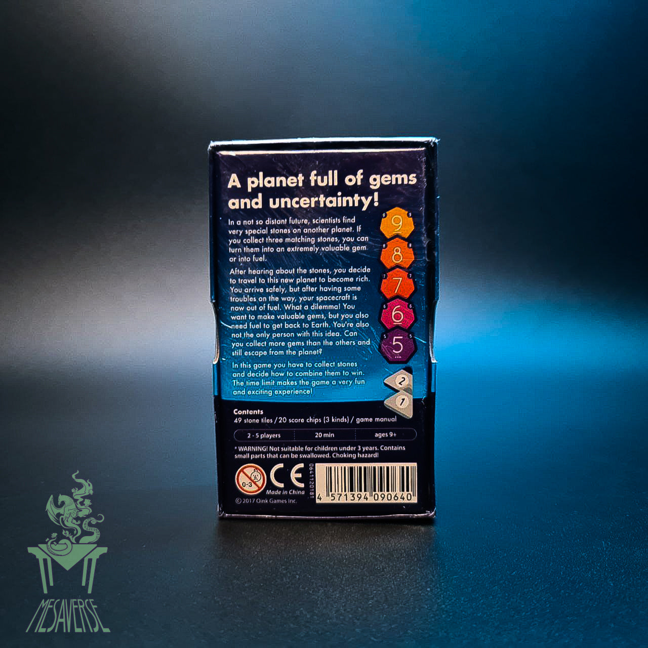 In the game, you place all the heptagonal tiles face down on the table, and on a turn you either draw a face-down tile or take a face-up tile that someone returned to the table. You're trying to collect both three tiles of the same number (to serve as fuel) and three tiles in numerical order (to transform into a gem). If you have no fuel, you can't win the game; of those who do have fuel, the player with the most valuable jewel wins.